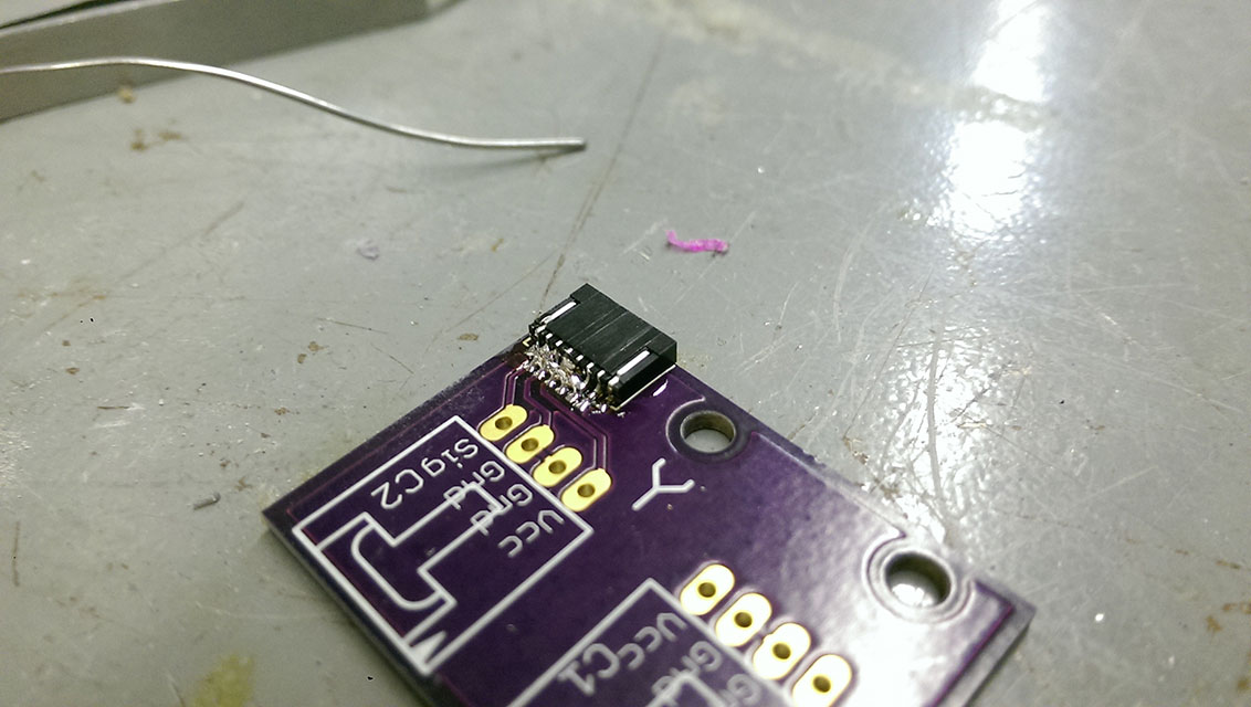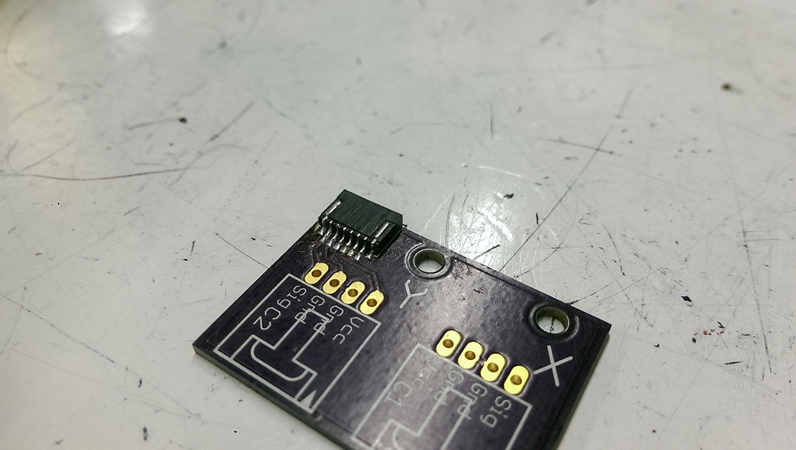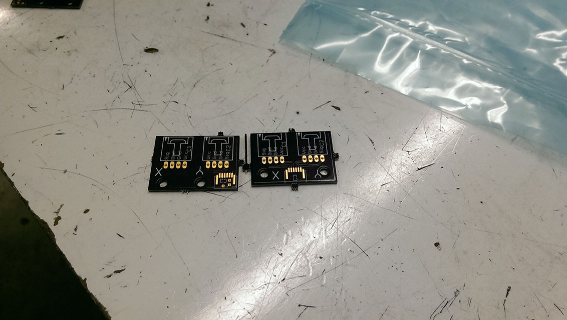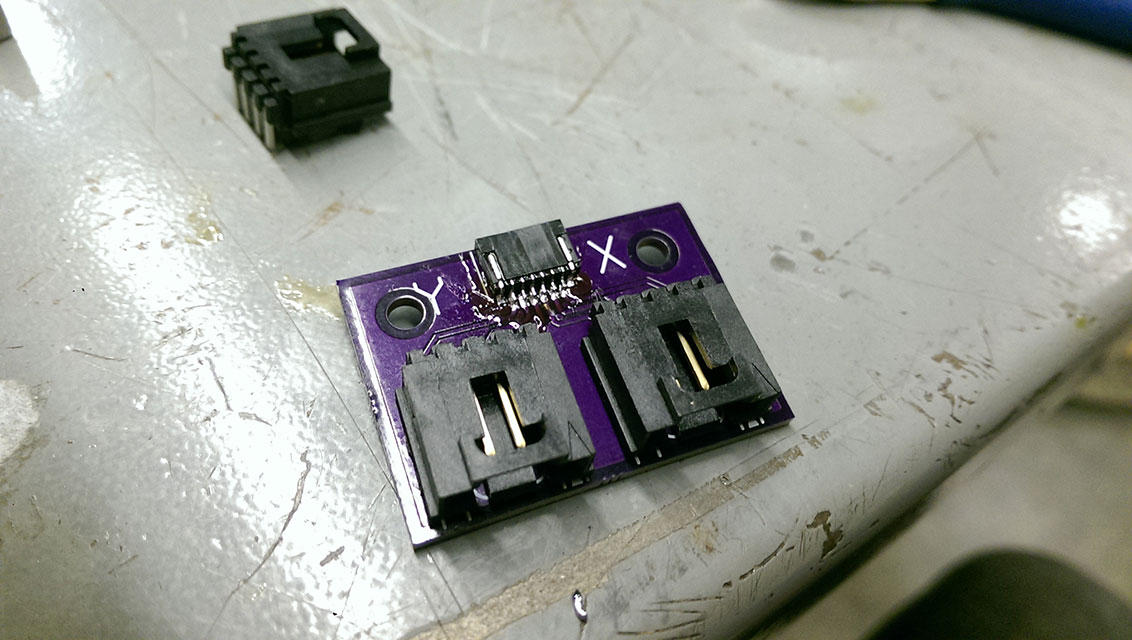 Rather than just have stranded wire jump from the endstop board to the MightyBoard, I whipped up these jumper boards, and had them fabbed at OSHPark.