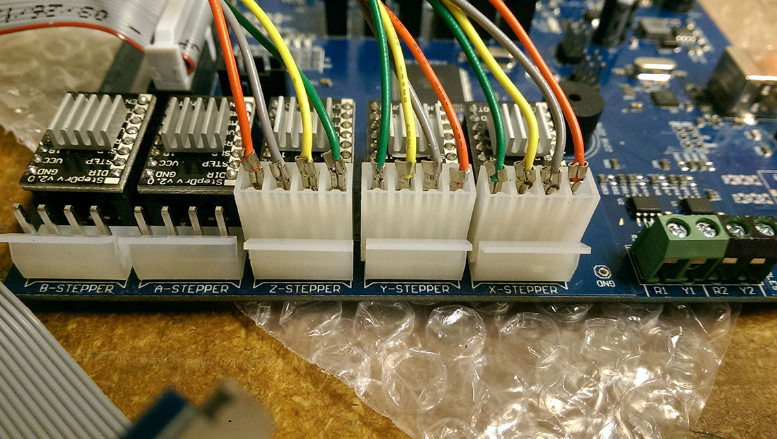 I'm going to digress a bit here to complain about MakerBot's terrible decision making on the stepper motor connectors. Look at these ridiculous beasts (The pins aren't pushed all the way in yet).