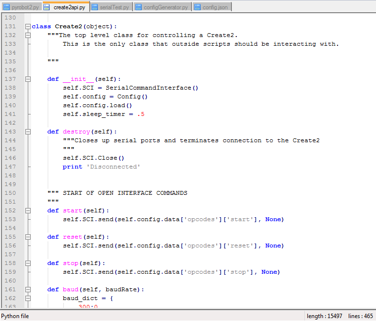 I initially looked at pyrobot2.py as the method of Create2 control. Originally written by Damon Kohler for a standard Roomba, it was modified by Jonathan Le Roux to work with the Create 2. Unfortunately, it shows... The API isn't very intuitive to use, and seemed much more in depth than is required for simple Create 2 control.